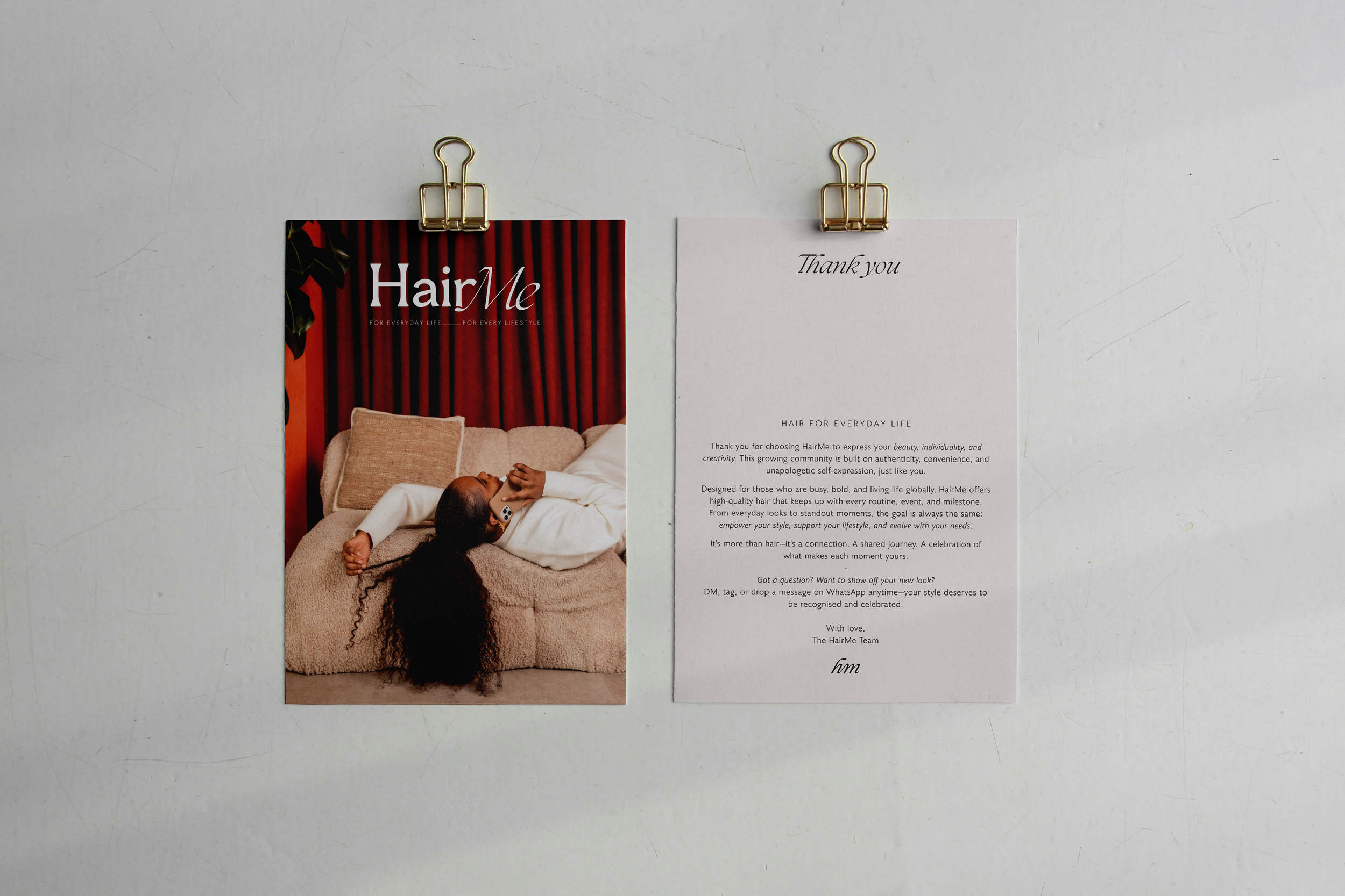 The HairMe logo embraces a clean, minimal aesthetic designed to feel timeless and versatile. The elegant combination of “H” and “M” forms a distinctive brand mark, while the tagline Hair for Everyday Life reinforces the brand’s commitment to effortless beauty. The simplicity of the design allows the emblem to shine as a modern symbol of confidence and ease.